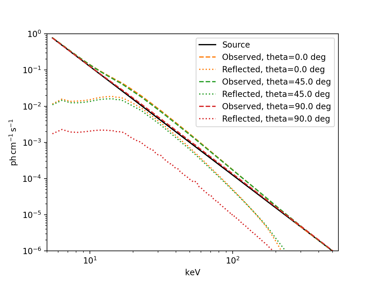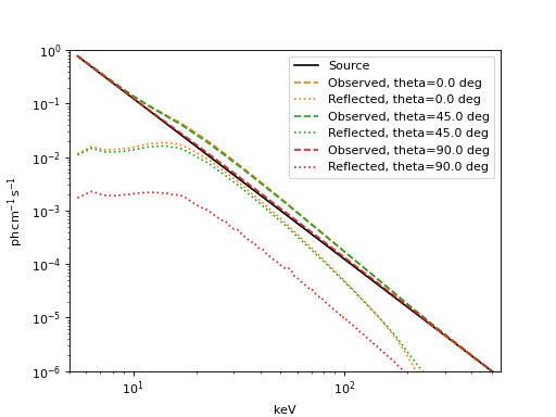 import astropy.units as u import numpy as np import matplotlib.pyplot as plt from astropy.modeling.powerlaws import PowerLaw1D from astropy.visualization import quantity_support from sunkit_spex.models.physical.albedo import Albedo e_edges = np.linspace(5, 550, 600) * u.keV e_centers = e_edges[0:-1] + (0.5 * np.diff(e_edges)) source = PowerLaw1D(amplitude=1*u.ph/(u.cm*u.s), x_0=5*u.keV, alpha=3) albedo = Albedo(energy_edges=e_edges) observed = source | albedo with quantity_support(): plt.figure() plt.plot(e_centers, source(e_centers), 'k', label='Source') for i, t in enumerate([0, 45, 90]*u.deg): albedo.theta = t plt.plot(e_centers, observed(e_centers), '--', label=f'Observed, theta={t}', color=f'C{i+1}') plt.plot(e_centers, observed(e_centers) - source(e_centers), ':', label=f'Reflected, theta={t}', color=f'C{i+1}') plt.ylim(1e-6, 1) plt.xlim(5, 550) plt.loglog() plt.legend() plt.show()